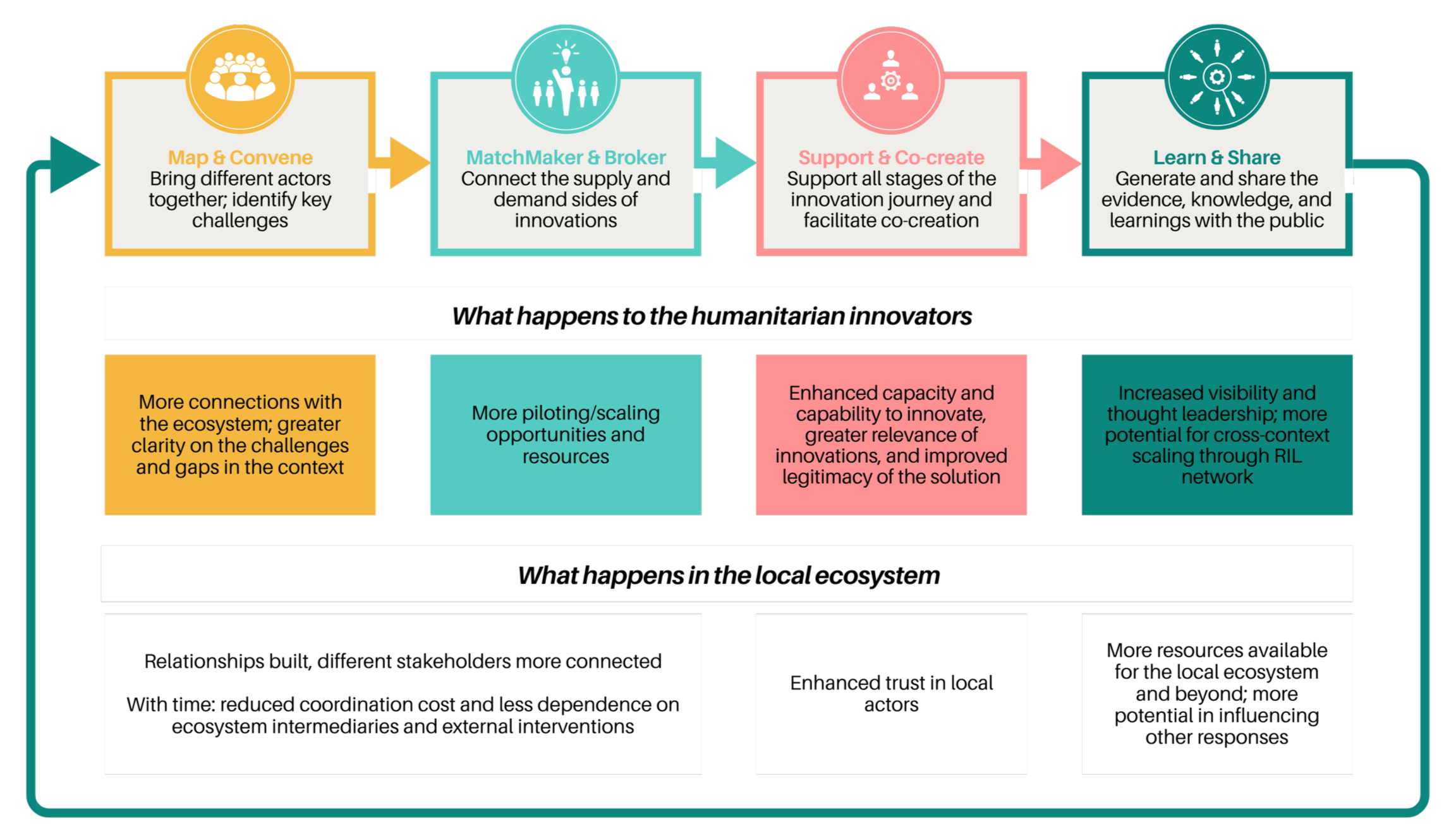 RIL strengthens local innovation ecosystems by brokering relationships, sharing capacity and evidence, and enabling collaboration so solutions can move faster from idea to impact for crisis-affected communities.
