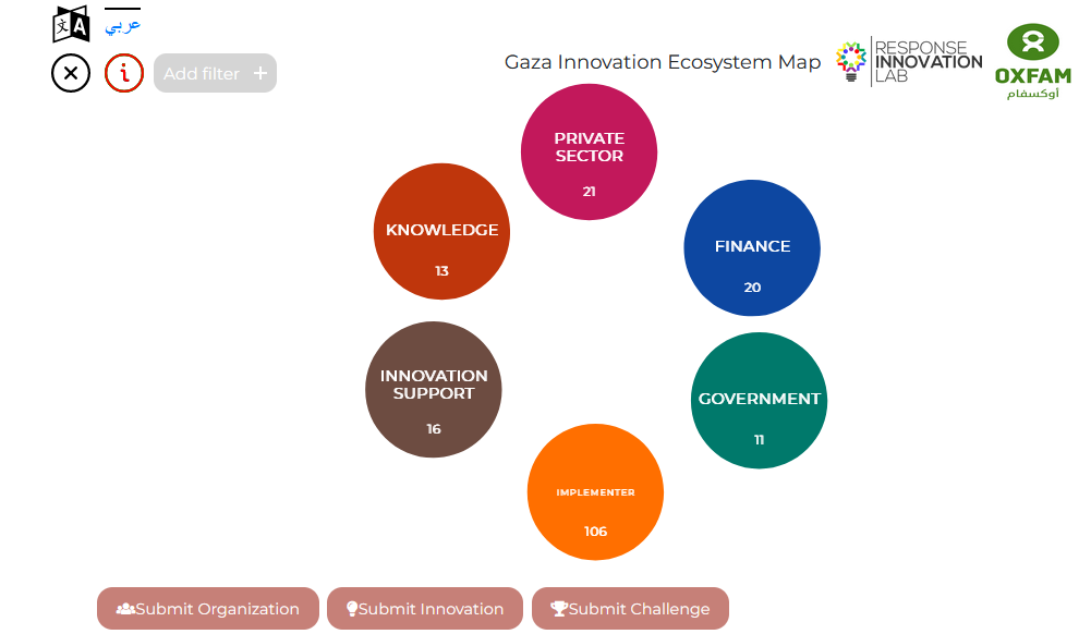 Based on the ecosystem mapping, the RIL has developed an interactive ecosystem map that could help partners in the country to navigate the humanitarian innovation ecosystem and find potential partners. It is not comprehensive of the whole innovation ecosystem as it focuses on humanitarian and social-impact innovation stakeholders/supporters.