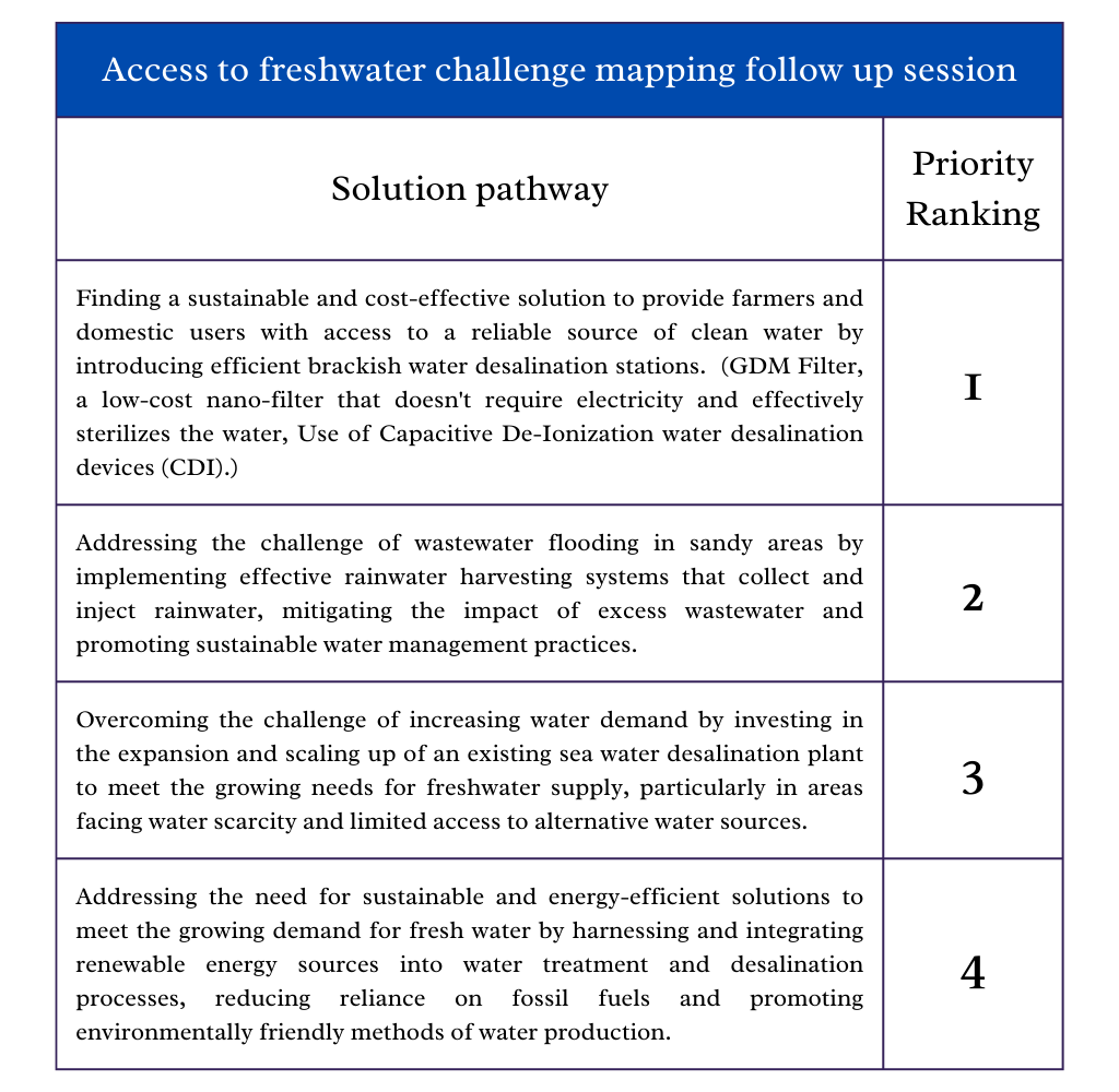 At the end of the session, the participants presented the priority areas of the feasible solution pathway. These areas were recognized as key focus areas for the GRIL and will be shared with the broader innovation ecosystem to promote collaboration and knowledge-sharing. The outcomes and recommendations from this session will guide future efforts in addressing the access to freshwater challenge in the Gaza Strip..